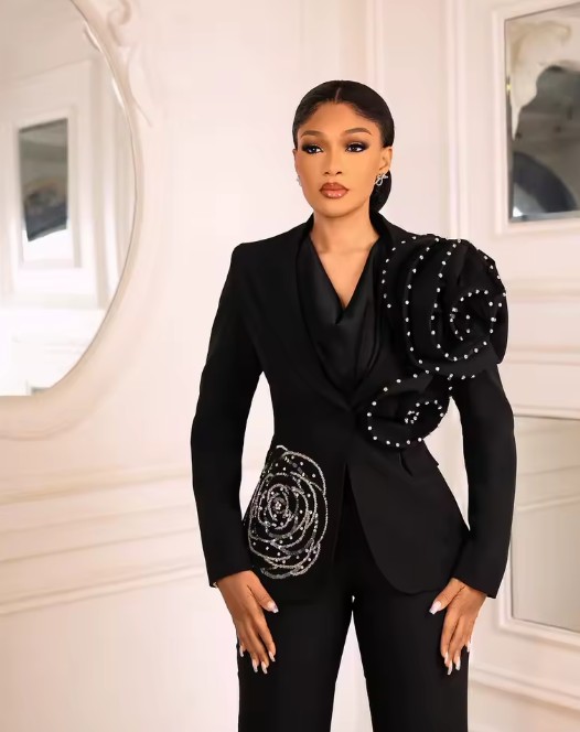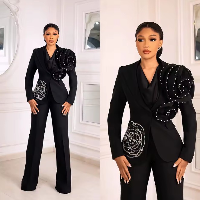 Black women’s formal pantsuit with floral and pearl appliqués