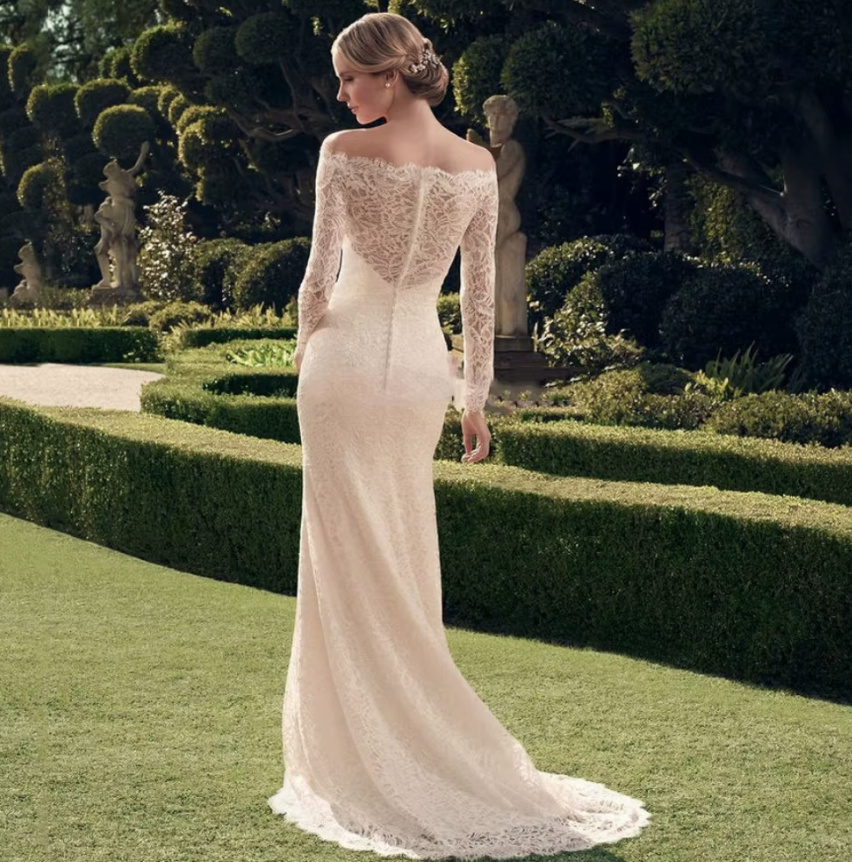 Off-the-shoulder wedding dress Carolyn with lace sleeves and train