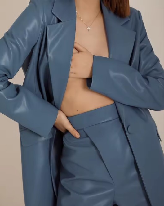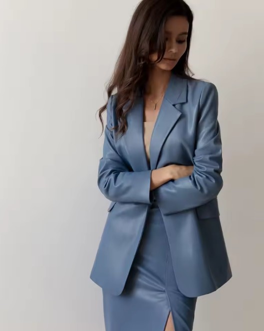 PU Leather Women’s Suit Elegant in Light Blue with Sexy Slit