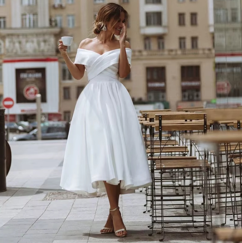 Off-the-shoulder A-line civil wedding dress Christel calf-length simple