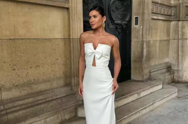 Off-the-shoulder sheath wedding dress Isabella with sexy bow