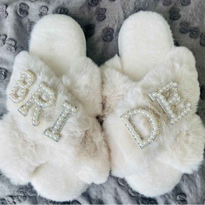 Soft plush slippers for the bride in white with pearls