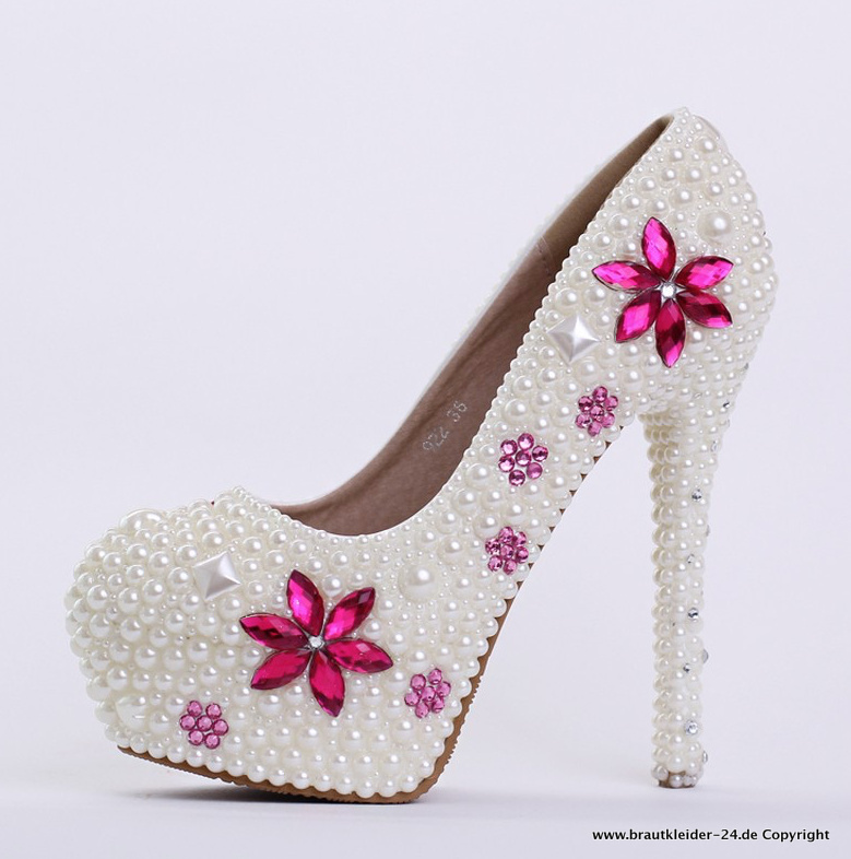 Plateau Perlen Brautschuhe in Weiß mit Blumen Applikationen in Pink