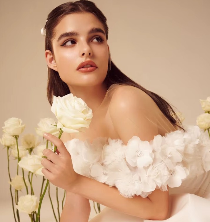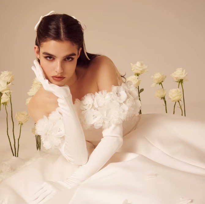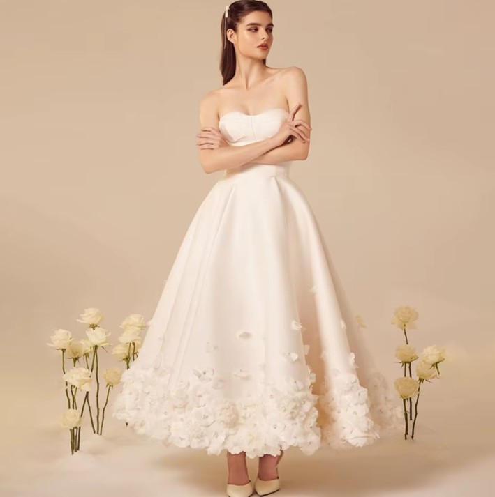 Off-the-shoulder A-line vintage style wedding dress, ankle-length with flowers