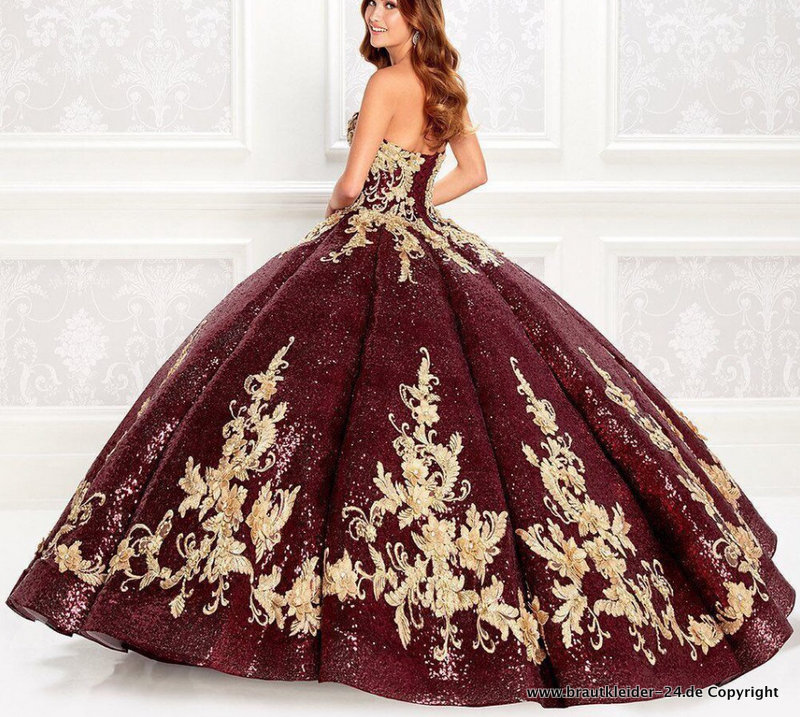 Pearl sequined ball gown, quinceañera dress, wedding dress in burgundy with embroidery