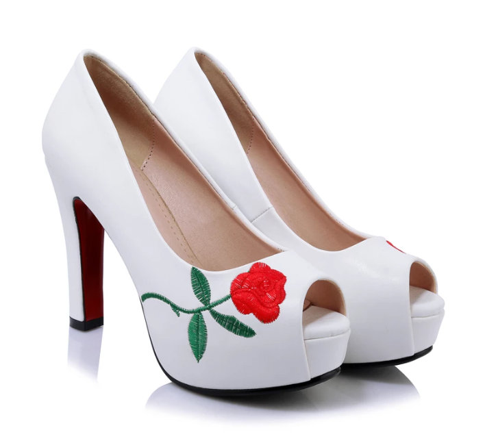 High Heels Brautschuhe Hochzeitsschuhe in Weiß mit Rote Rose