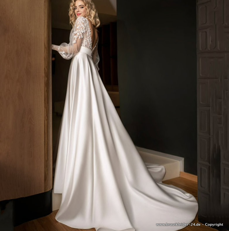 V Ausschnitt Brautkleid Hochzeitskleid mit Tüll Ärmel