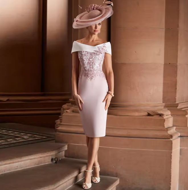 Off-the-shoulder pencil dress Jamie with lace, calf-length in dusty rose