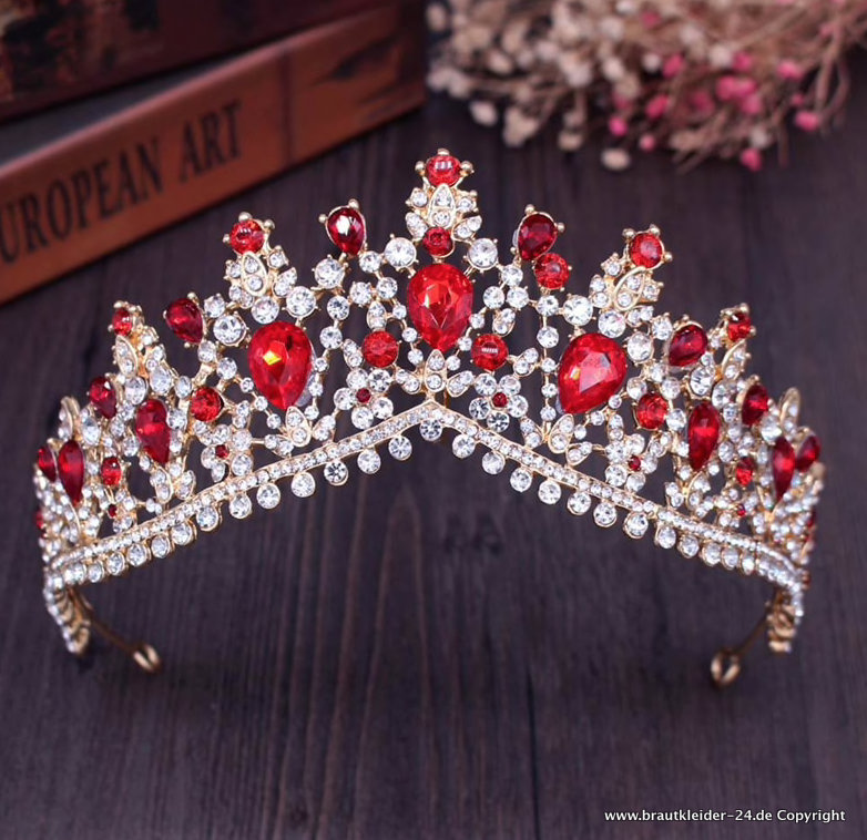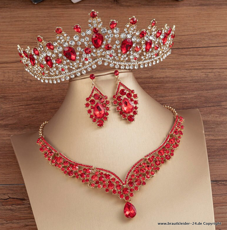 Kristall Brautschmuck Set Krone Halskette und Ohrringe in Silber Rot