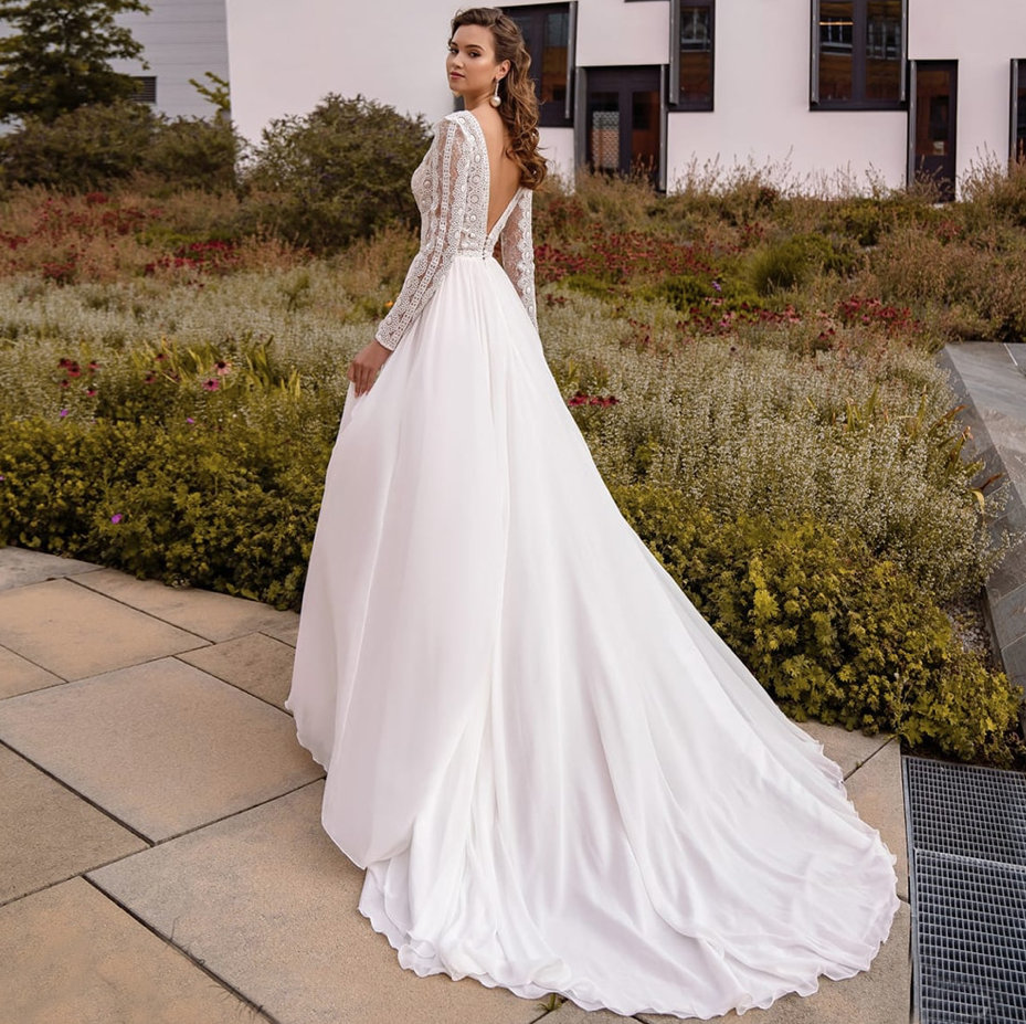 A-line long-sleeved chiffon wedding dress Carola Boho style with train