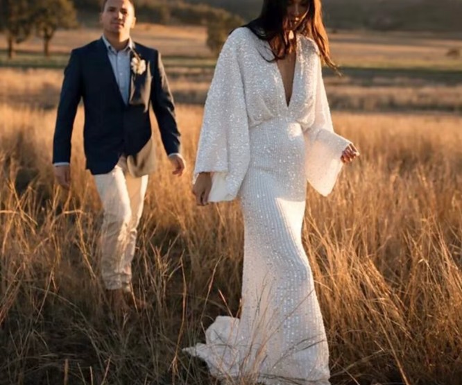 Long-sleeved I-line glitter wedding dress Iseabail with sexy V-neck