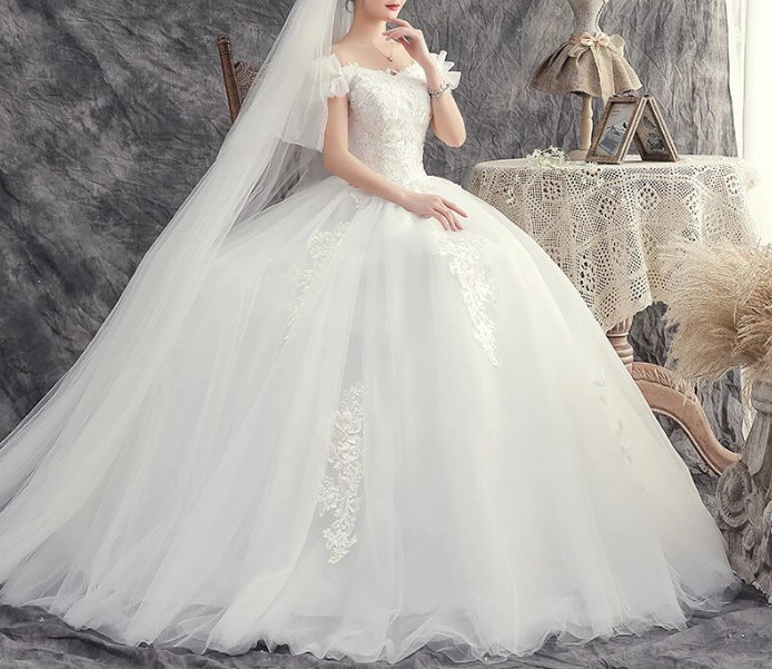 Ball gown style, off-the-shoulder wedding dress with appliqués