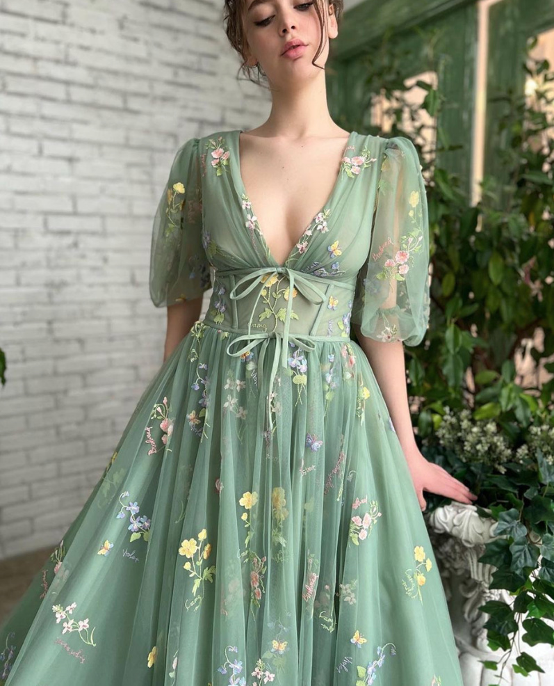 Elegant A-line maxi dress for wedding guests in green with flowers