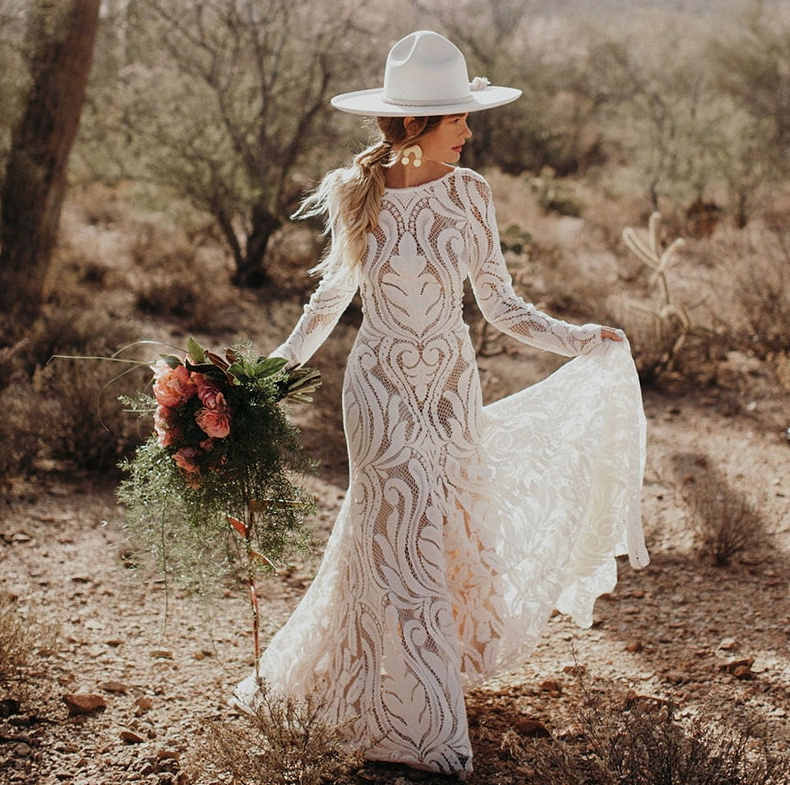 I-line long-sleeved boho style wedding dress with train
