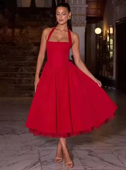 Neckholder Träger Mini Cocktailkleid in Rot Wadenlang