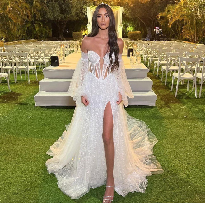 Off-the-shoulder boho A-line wedding dress with cut-out sleeves and train