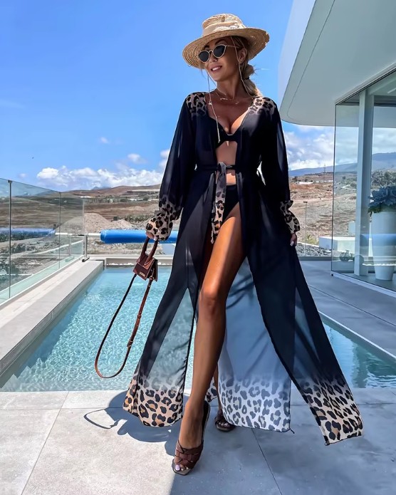 A-line long-sleeved beach cover-up dress with leopard print, black