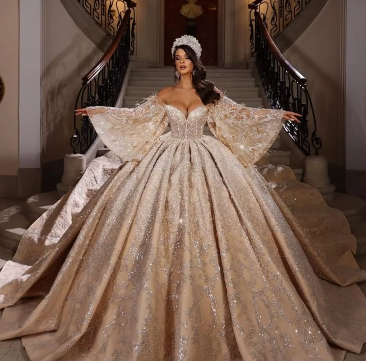 Long-sleeved princess glitter wedding dress Iekika, off-the-shoulder with cathedral train