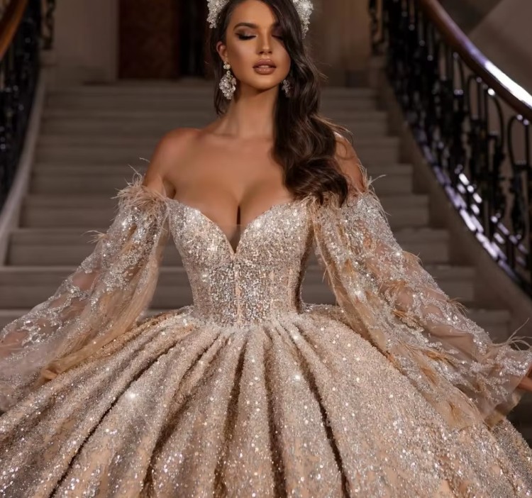Langarm Prinzessinnen Glitzer Brautkleid Iekika Schulterfrei mit Kathedralen Schleppe