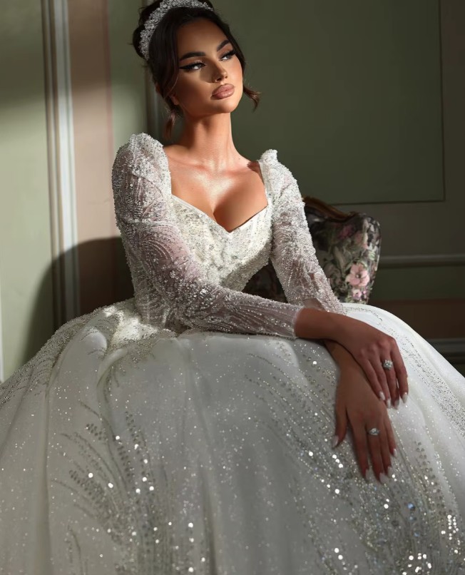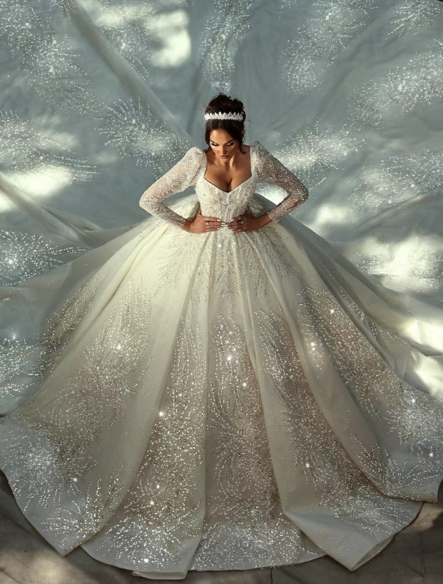 Long-sleeved princess glitter wedding dress Isabella with cathedral train