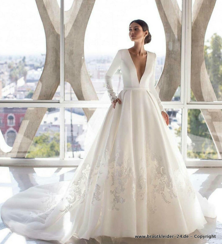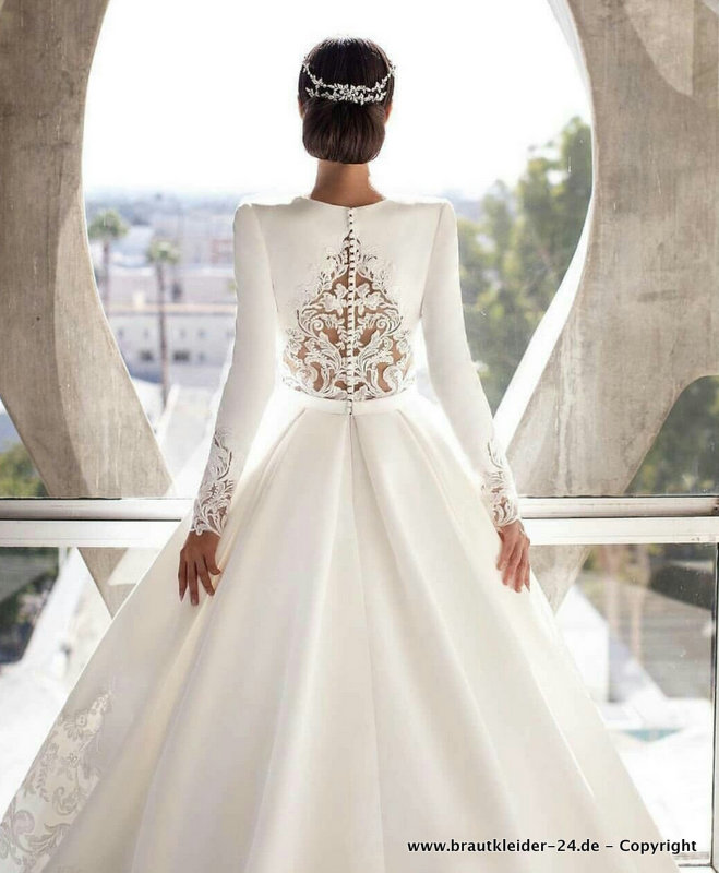 Langarm Satin Brautkleid Hochzeitskleid mit Schleppe und Spitze