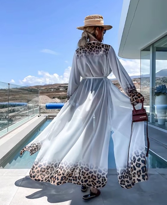 A-line long-sleeved beach cover-up dress with leopard print, white
