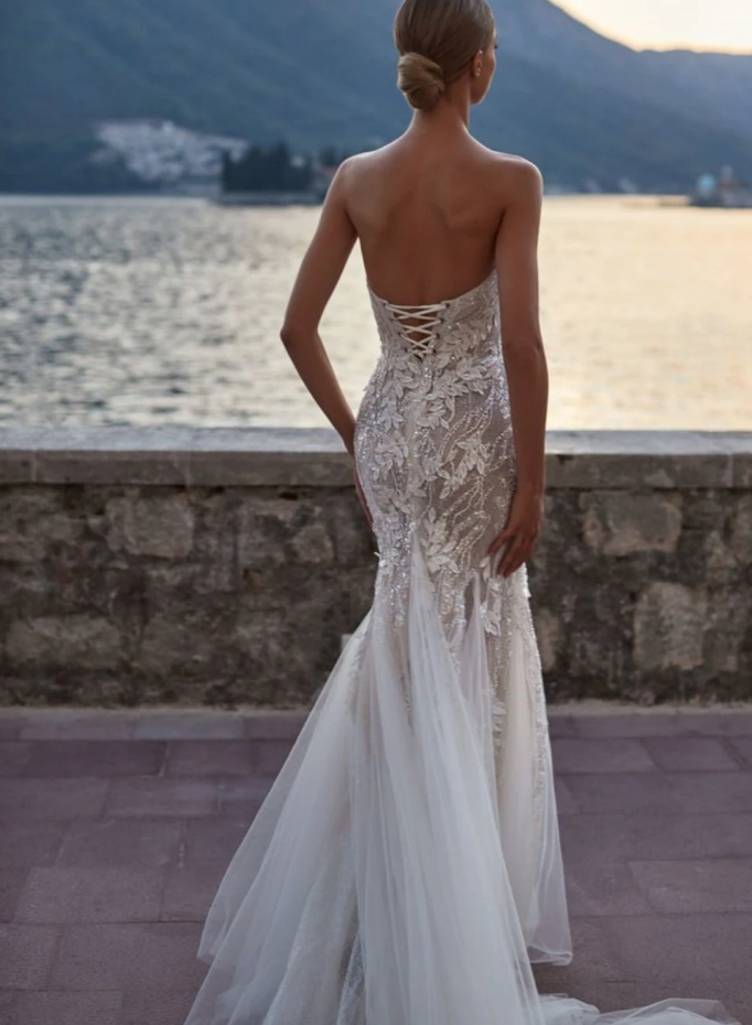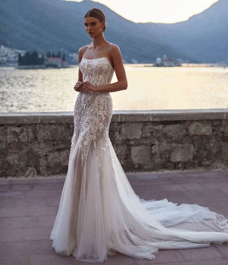 Spaghetti strap luxury boho wedding dress with train and lace
