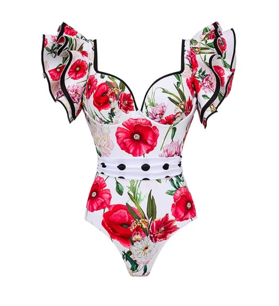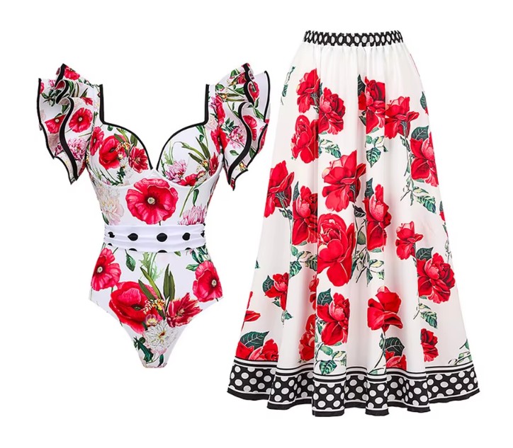 Floral pattern vintage style swimsuit with skirt set