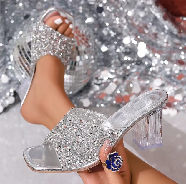 Glitter sequin summer sandals, bridal shoes in silver