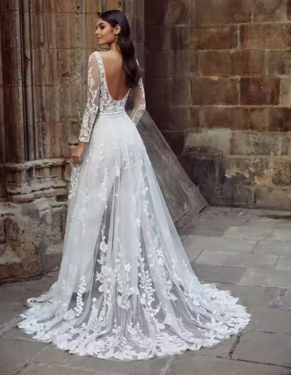 Kennya long-sleeved wedding jumpsuit with detachable train
