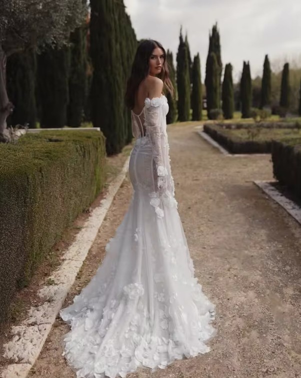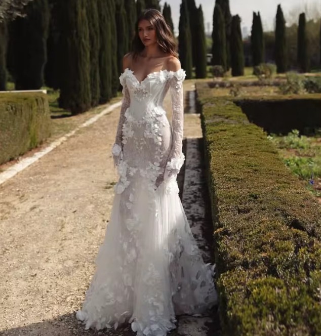 Schulterfreies Langarm Fit and Flare Brautkleid Kaelyn mit Blumen
