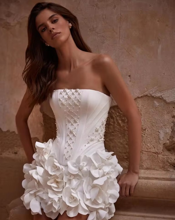 Schulterfreies Mini Brautkleid Kora mit Perlen und 3D Blumen