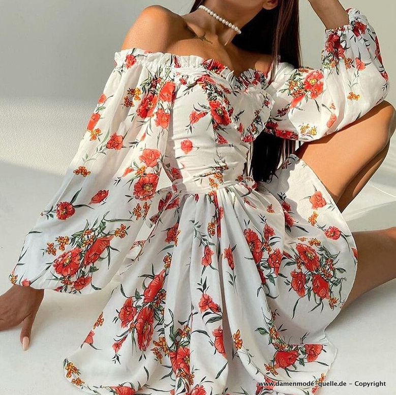 A Linie Sommerkleid Kurz Schulterfrei in Weiß mit Blumenmuster