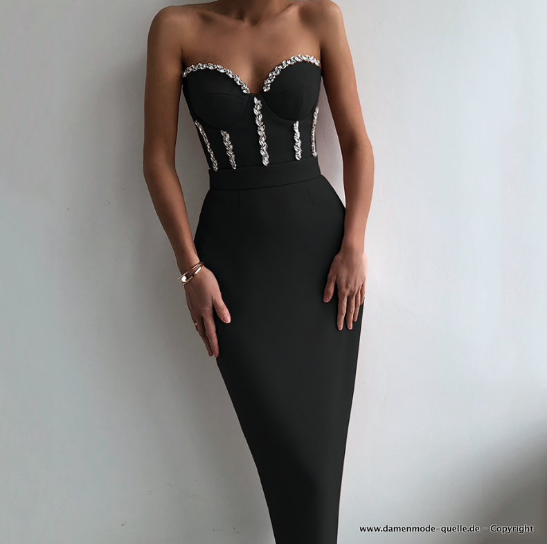 Bleistift Bustie Kleid Elegant in Schwarz Wadenlang mit Pailletten