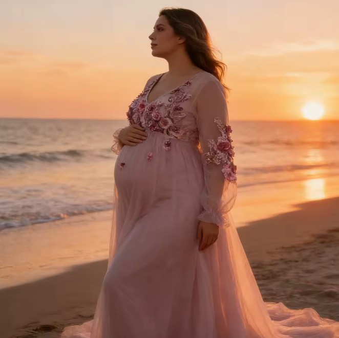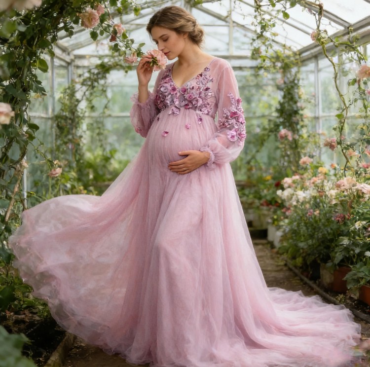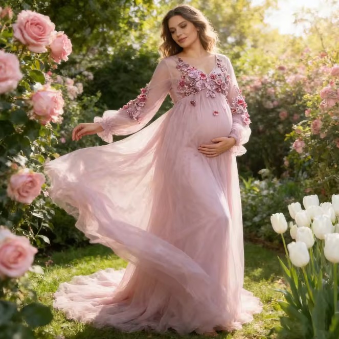 Boho style long-sleeved maternity wedding dress in pink with 3D flowers