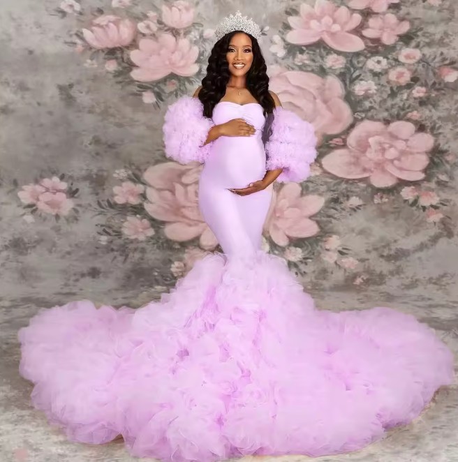 Mermaid maternity wedding dress Janina, off-the-shoulder with ruffled sleeves, detachable, pink