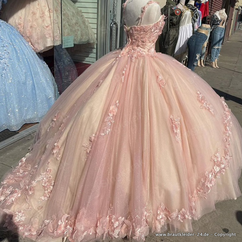 Rosa Sparkly Quinceanera Brautkleid mit Träger und Blumen Spitze