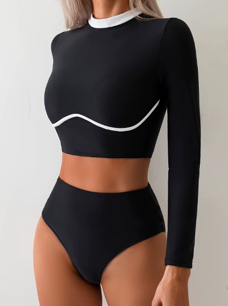 Langarm Vintage Stil Sport Bikini in Schwarz