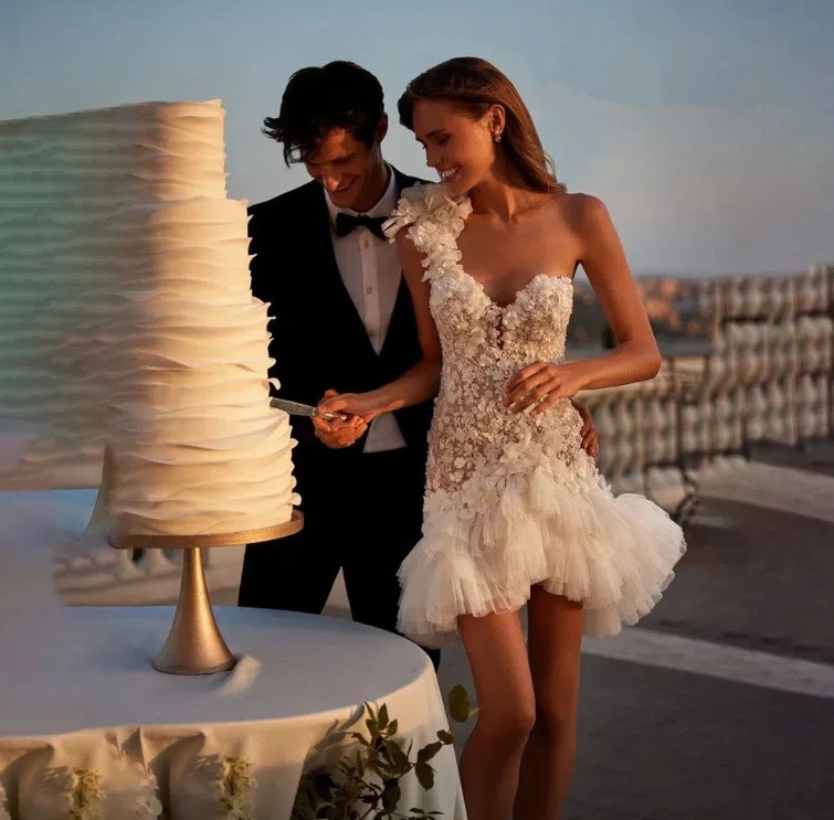 One-shoulder mini wedding dress with flowers and ruffles