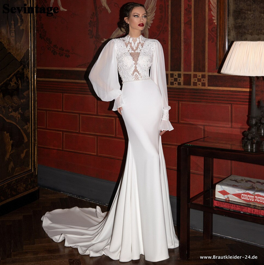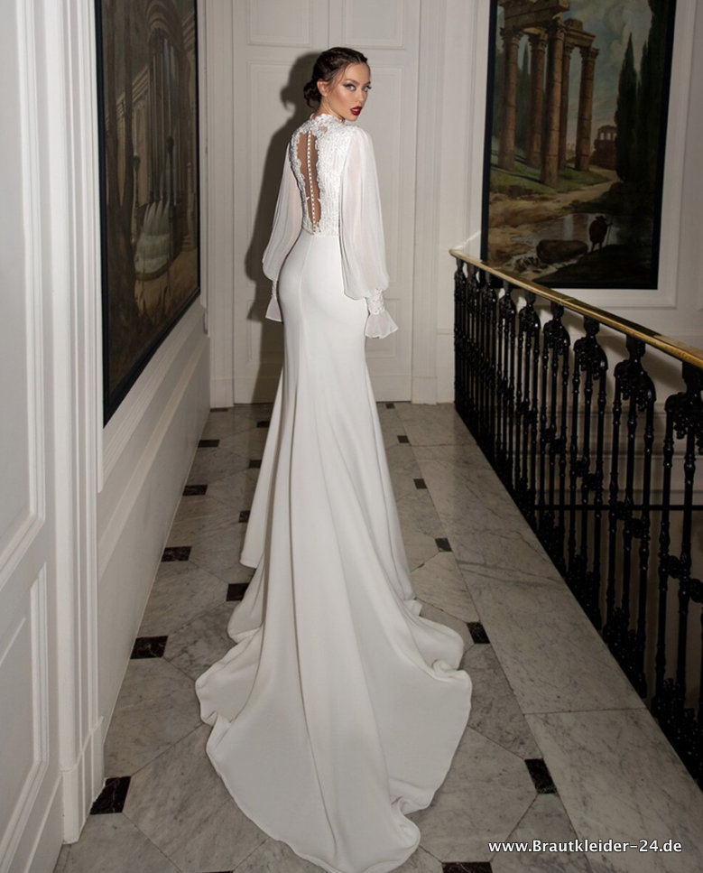 Satin Meerjungfrau Brautkleid Nadja mit Spitzen Ausschnitt und Schleppe