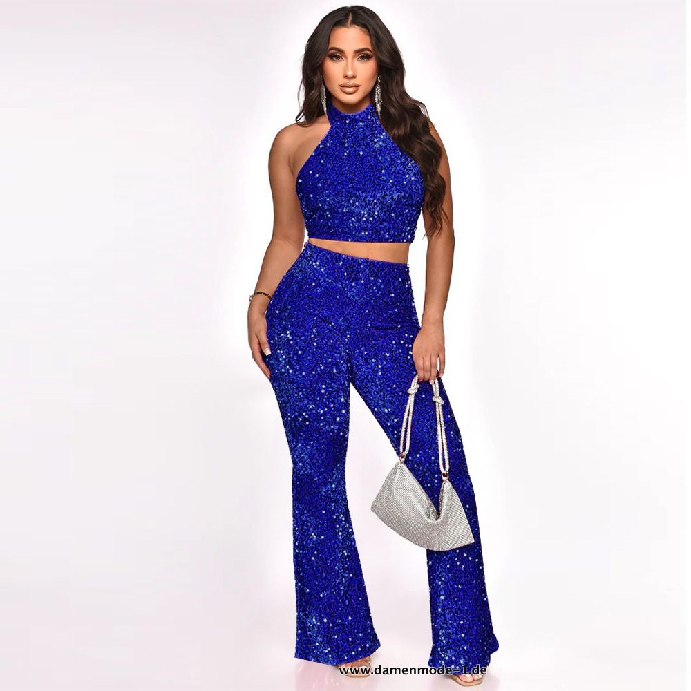 Pailletten Damen Neckholder Crop Top und Flare Hose in Blau
