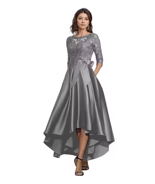 A-line high-low dress, elegant jean style for wedding guests in silver with lace