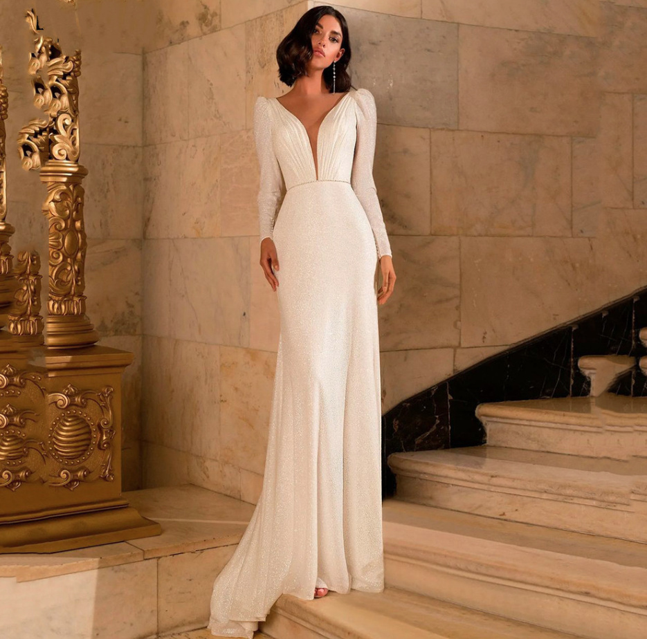 Long-sleeved I-line wedding dress Edith with sexy V-neck and brush train
