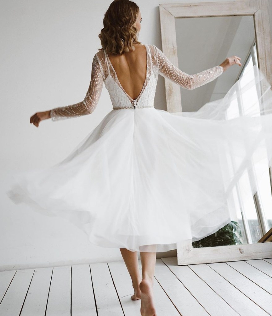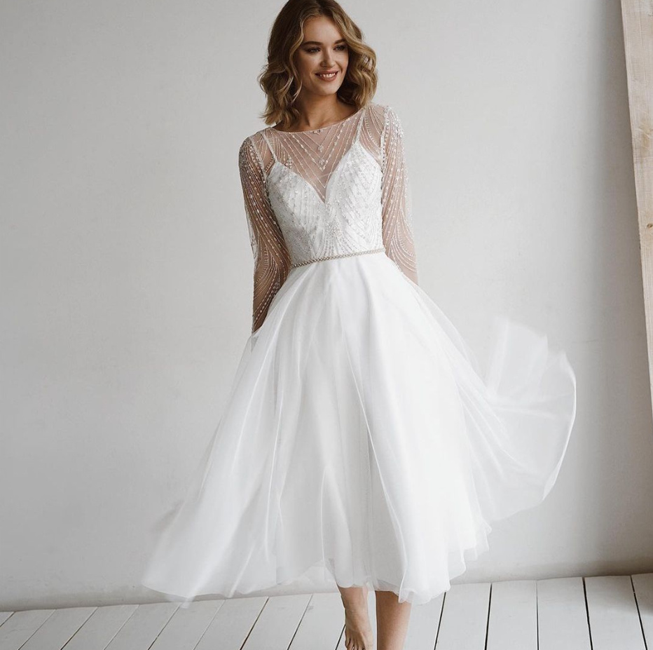 Long-sleeved A-line wedding dress Eve, calf-length with pearl embroidery