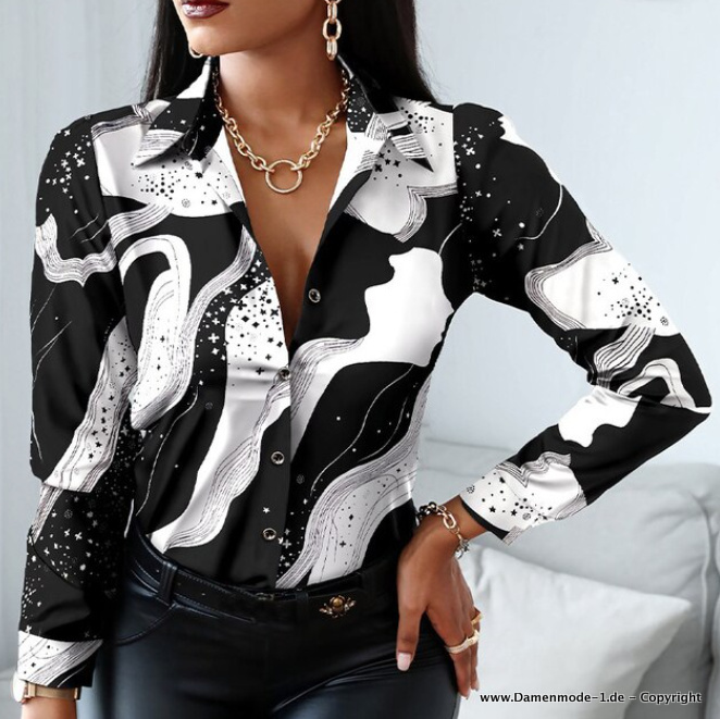 Patchwork Langarm Damen Bluse Elegant Schwarz Weiß