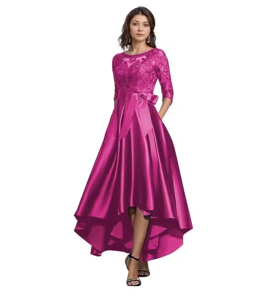 A-line high-low dress, elegant jean style for wedding guests in pink with lace