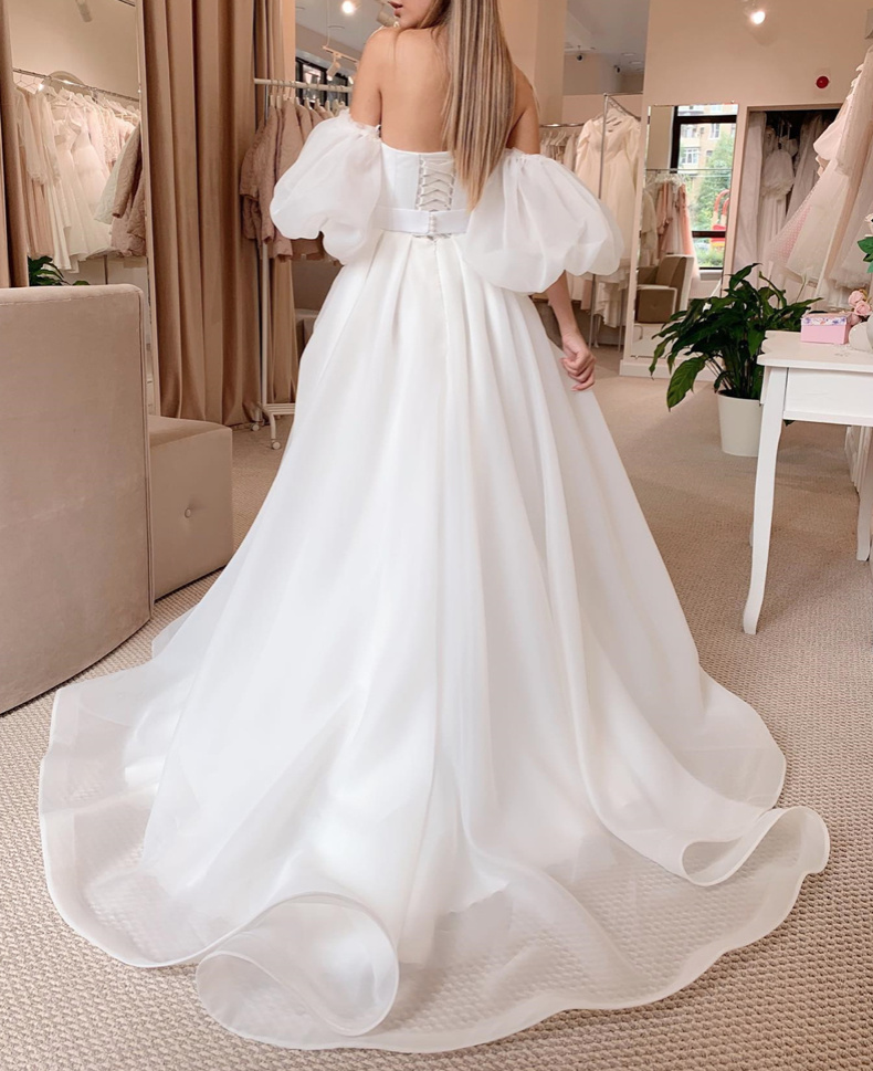 Off-the-shoulder A-line chiffon wedding dress Ermelina with lantern sleeves, floor-length