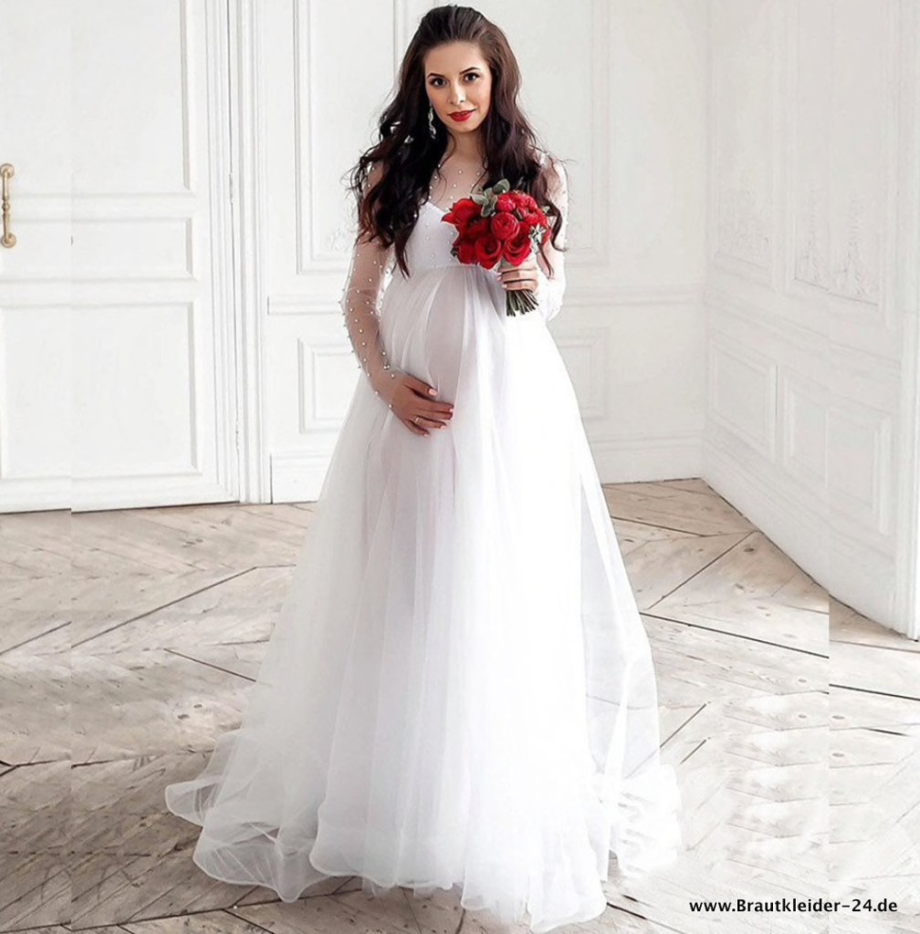 A Linie Langarm Brautkleid für Schwangere mit Perlen in Weiß