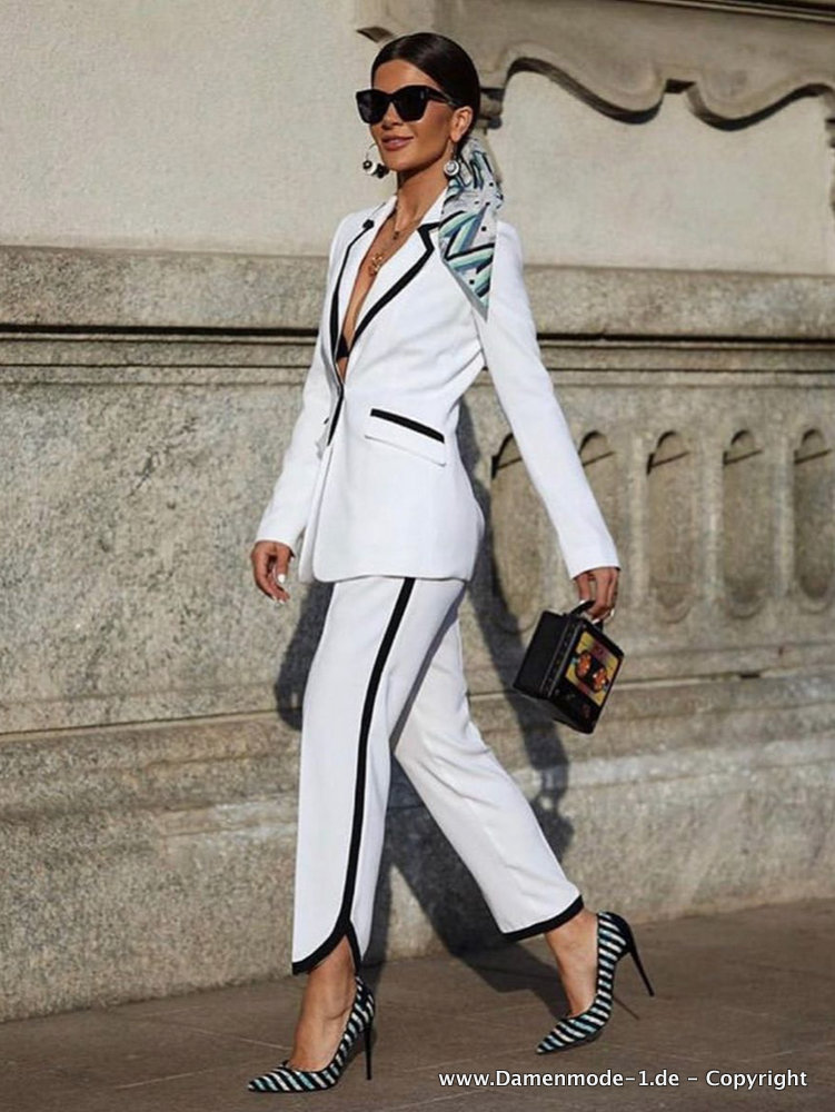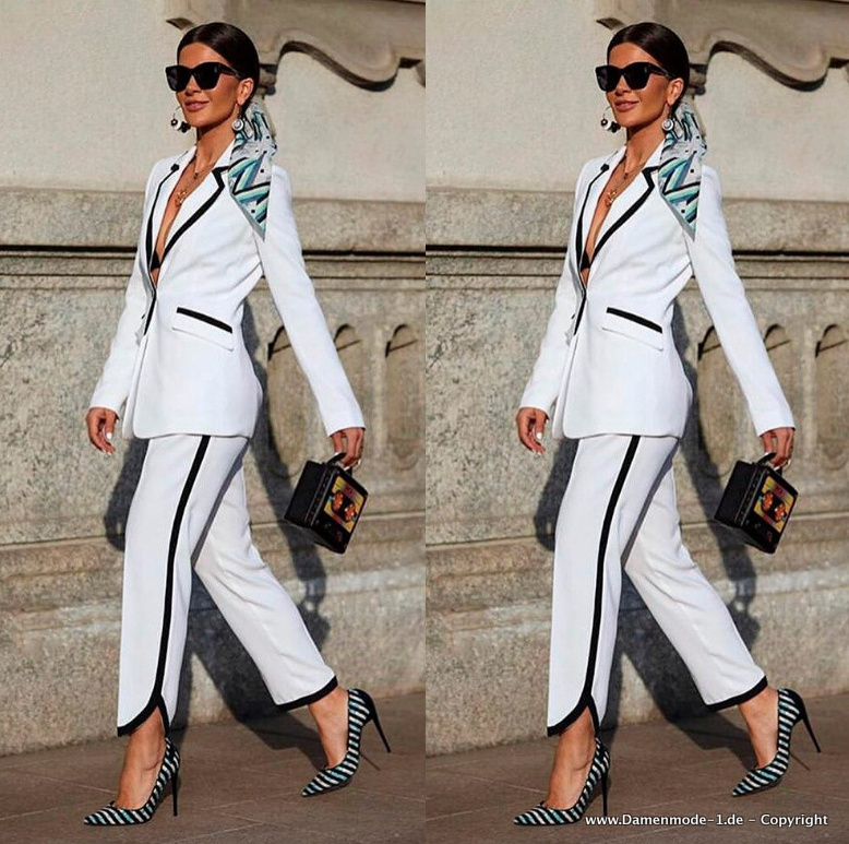 Eleganter Hosenanzug in Weiß mit V Ausschnitt und Applikationen in Schwarz