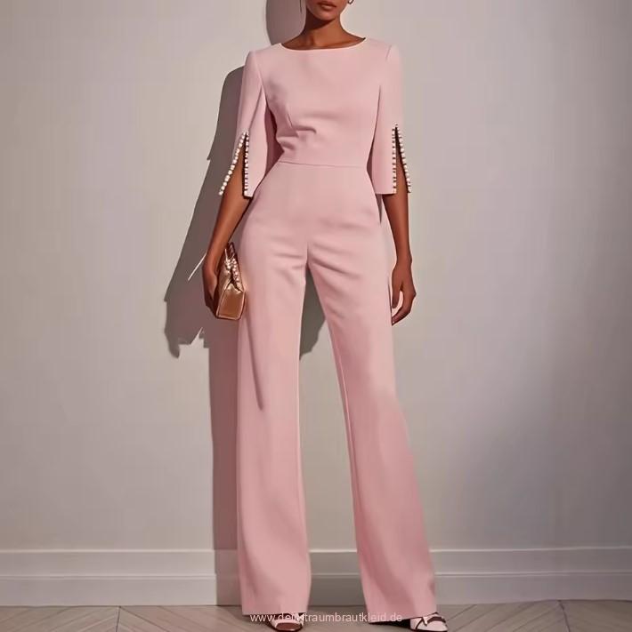 I-line bridal jumpsuit for the civil ceremony with pearl appliqués, pink